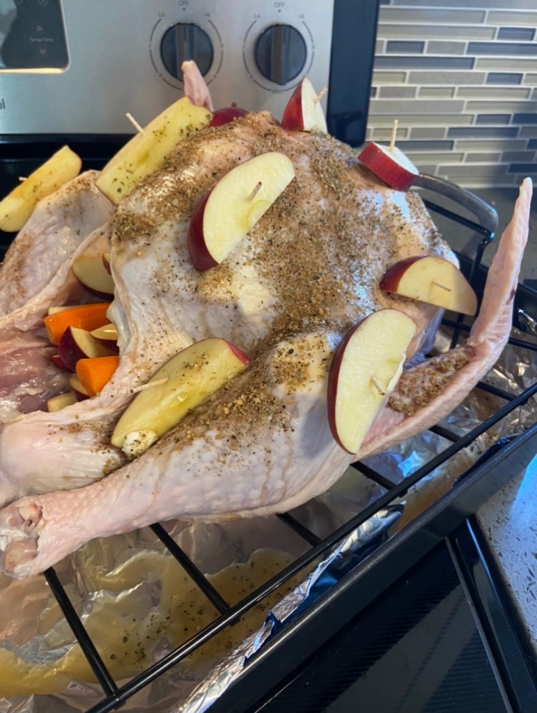 -Stuff with apple slices & any additional stuffings of your choosing. Pin apple sliders with tooth picks throughout the outside of the turkey.